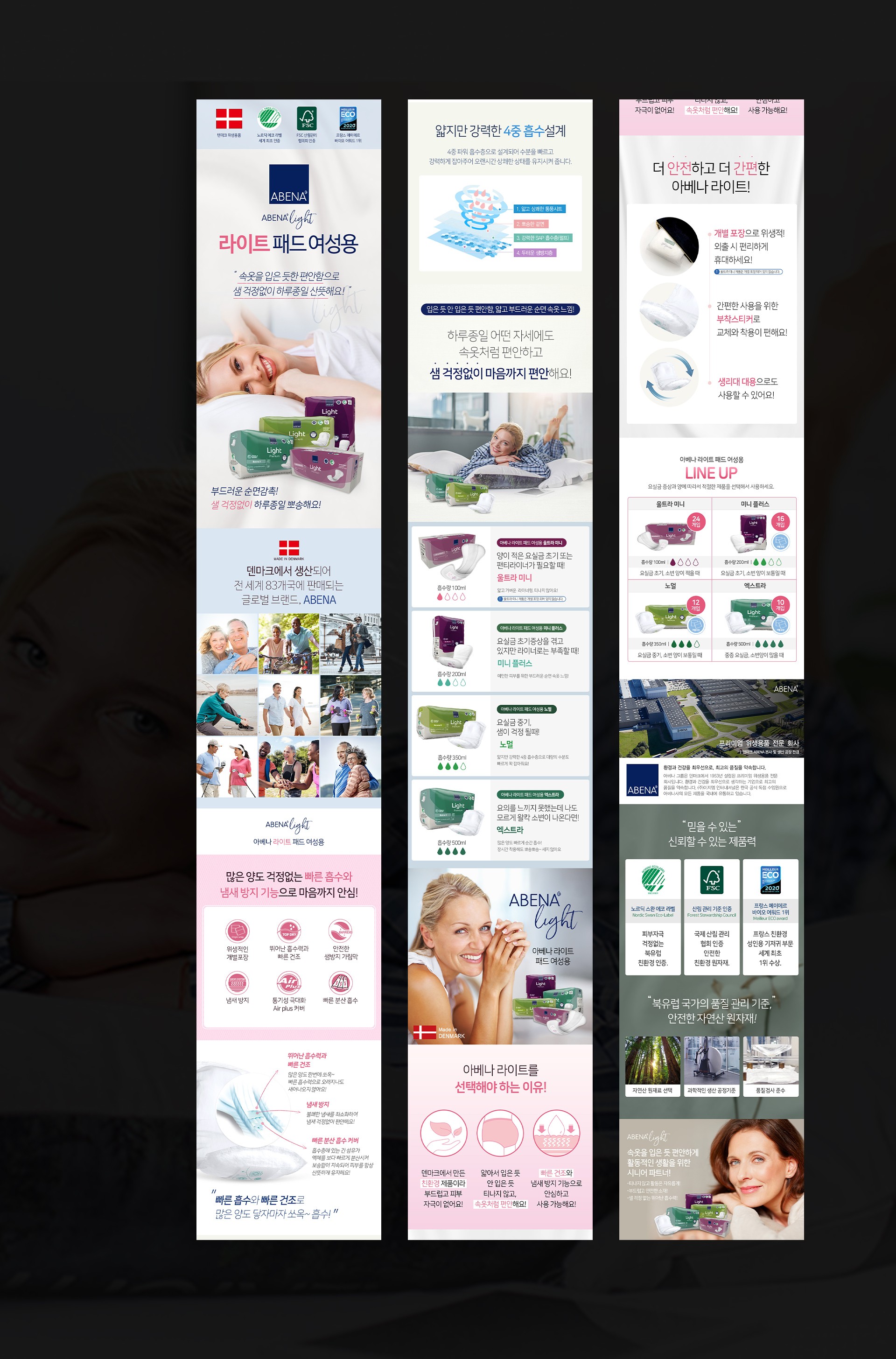 PROJECT DESCRIPTION 덴마크에서 생산된 유럽산 프리미엄 위생용품 브랜드 아베나. 요실금 케어와 거동이 불편한 사용자를 고려해, 차분하고 존중감 있는 톤으로 접근했습니다. 과도한 장식은 배제하고 신뢰감 있는 컬러와 정제된 레이아웃을 통해 성인 위생용품으로서의 전문성과 편안함을 강조했습니다. TOOLS Photoshop · Illustrator